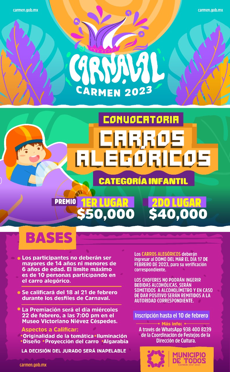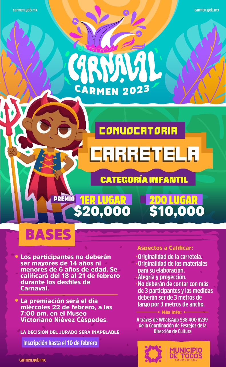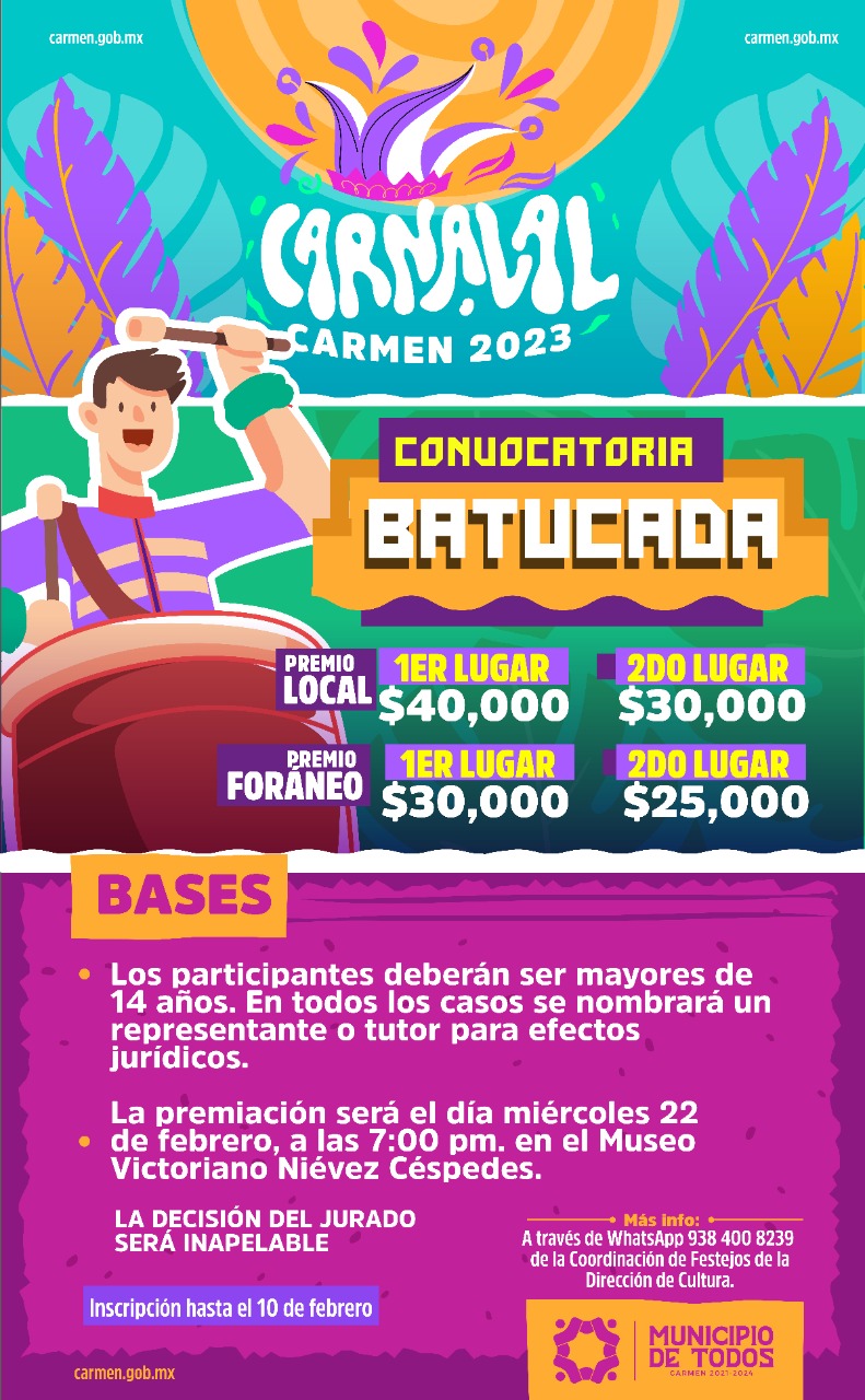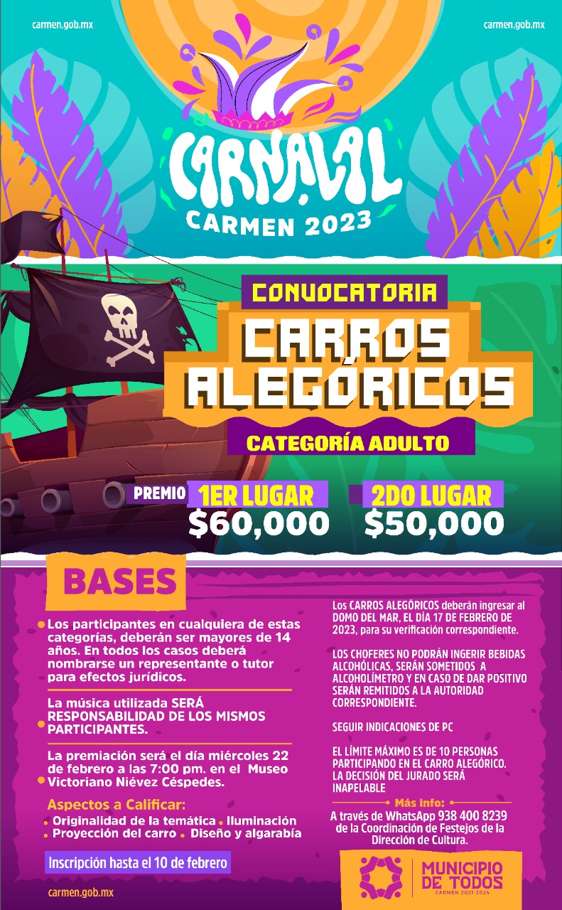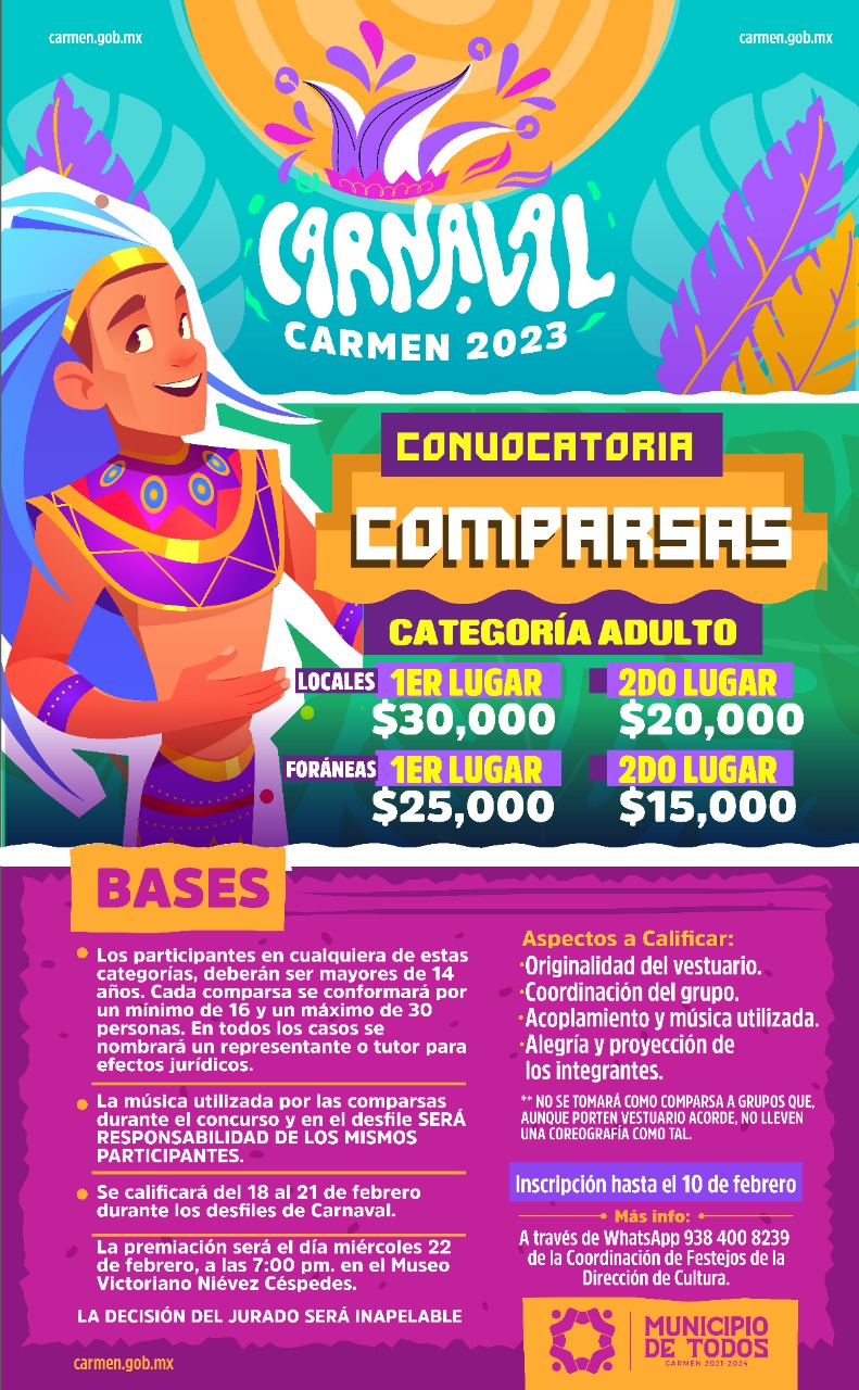 Disfruta de la diversión en el Carnaval de Todos, el Gobierno Municipal de Carmen, a través de la Dirección de Educación y Cultura, convoca a la ciudadanía en general a participar en los diversos concursos que se realizarán en el marco de las fiestas carnestolendas en su edición 2023.