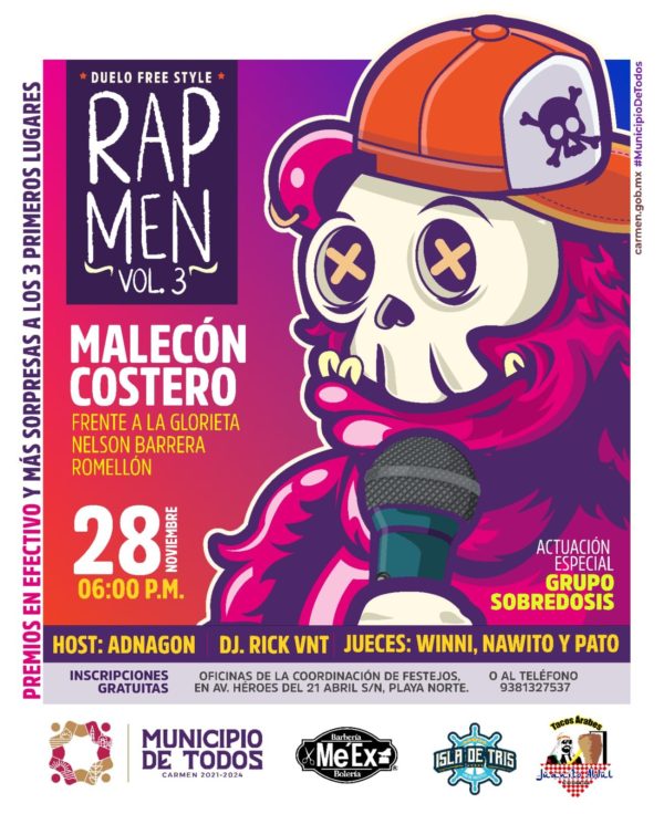 Es momento de hacer sonar tu voz y tus ideas en el Duelo Free Style Rap Men Vol. 3 que se realizará el próximo domingo 28 de noviembre en el Malecón Costero en punto de las 06:00 P.M., el Gobierno Municipal de Carmen, a través de la Dirección de Educación y Cultura, te invita a participar, la inscripción es totalmente gratis.