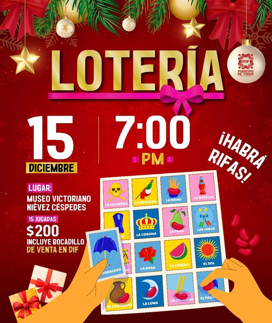 El evento será realizado el 15 de diciembre a las 7:00 PM en el Museo “Victoriano Niévez Céspedes”, el costo del boleto es de $200 pesos e incluye la entrada y un delicioso bocadillo. Además de que podrás degustar otros platillos y bebidas que estarán a la venta, y la oportunidad de ganar premios y muchas sorpresas en esta lotería.