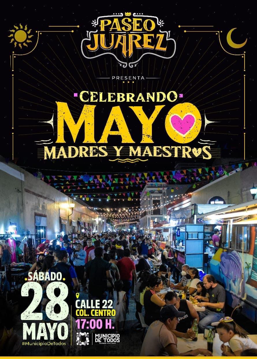 Con motivo de festejar el Día de las Madres y el Día del Maestro, la Coordinación de Turismo y el Gobierno Municipal de Carmen, te invitan a disfrutar del Paseo Juárez “Celebrando Mayo”, este sábado 28 de mayo a partir de las 5:00 P.M., donde encontrarás muchas sorpresas, diversión y un gran ambiente que reunirá a más de 200 comerciantes, incluyendo foodtrucks y artesanos locales, con la finalidad de hacer en grande estas fechas especiales.