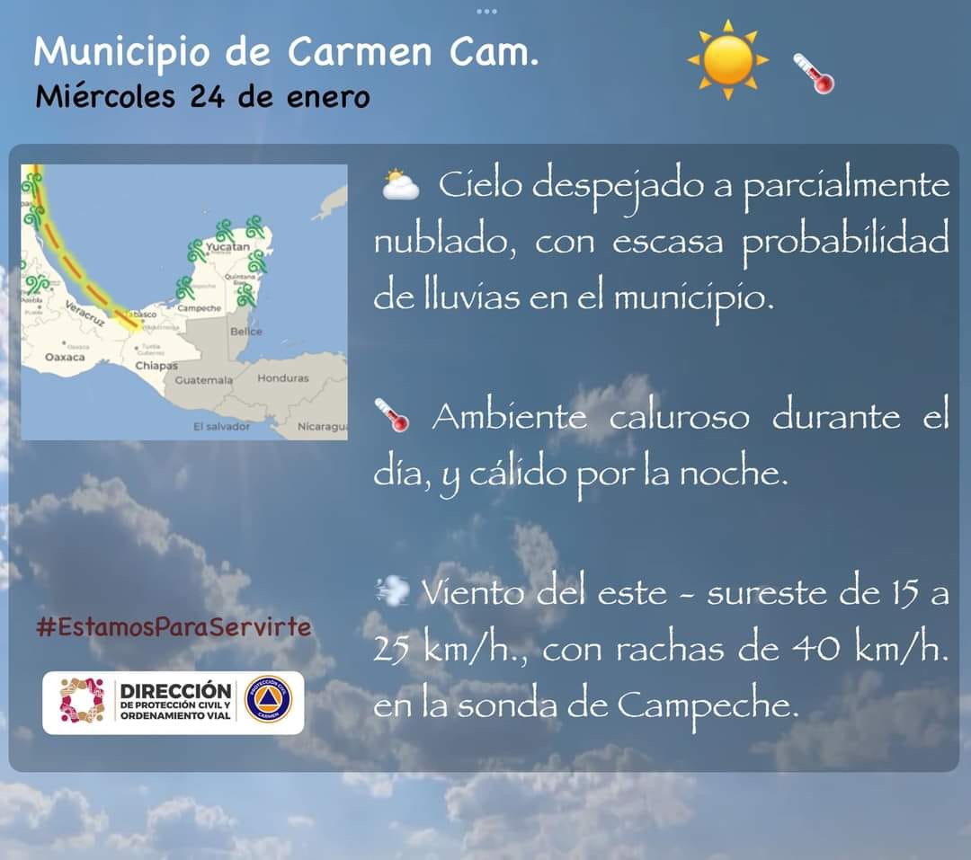 Para hoy, debido al ingreso de aire marítimo tropical proveniente del Mar Caribe y Golfo de México hacia la región, y el fuerte calentamiento diurno, se prevén las siguientes condiciones para nuestro municipio.