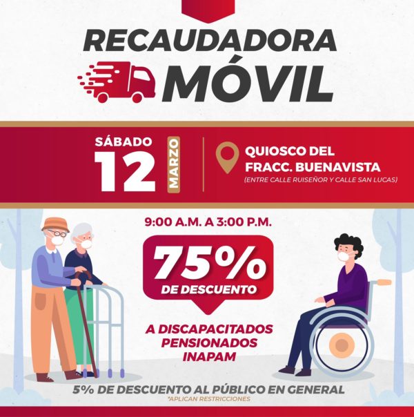 Para que ahorres tiempo y que los trámites sean más accesibles, este sábado 12 de marzo la Recaudadora Móvil estará en el Quiosco del Fracc. Buenavista de 9:00 A.M. a 3:00 P.M., donde podrás realizar tu pago de impuesto predial.