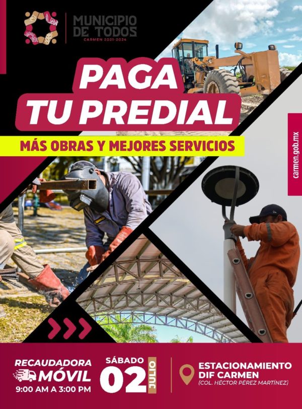 Para que ahorres tiempo y que los trámites sean más accesibles, este sábado 2 de julio la Recaudadora Móvil estará en el estacionamiento de las oficinas del DIF Carmen, ubicadas sobre la calle 35 de la col. Héctor Pérez Martínez, de 9:00 A.M. a 3:00 P.M., donde podrás realizar tu pago de impuesto predial.