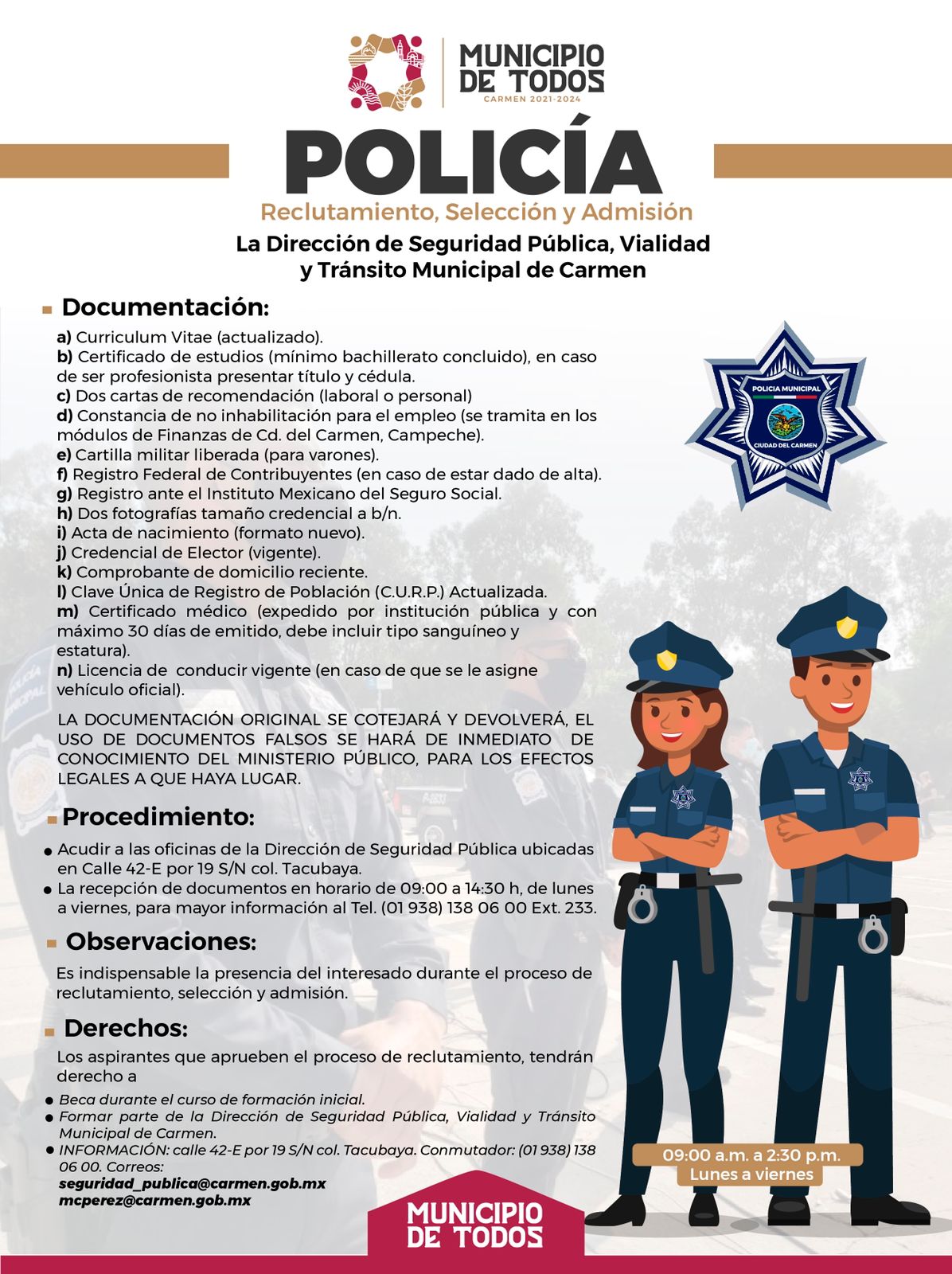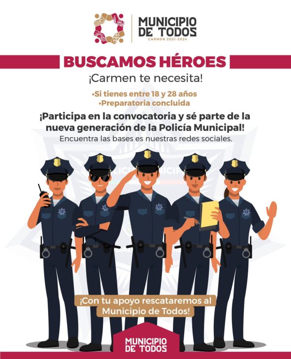 Ante el gran interés que ha generado entre la población el llamado a formar parte de la Policía Municipal, la Dirección de Seguridad Pública, Vialidad y Tránsito Municipal de Carmen amplía la convocatoria 2021-2022, quedando abierta del 1 al 28 de febrero.