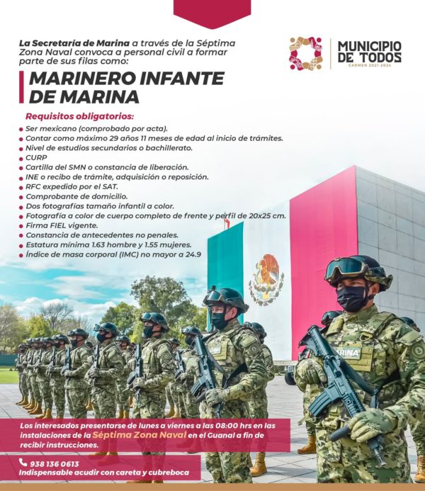 Súmate a la transformación del país, la Secretaría de Marina (Semar), a través de la Séptima Zona Naval, convoca a hombres y mujeres a formar parte de sus filas como Marinero Infante de Marina.
