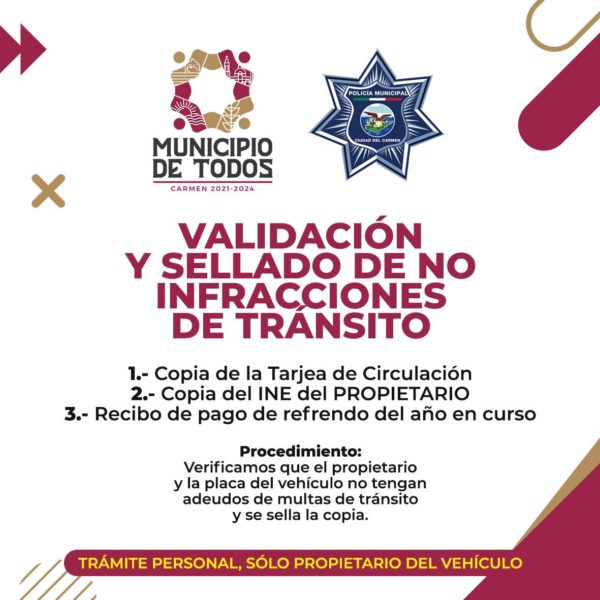 Si quieres contar con el engomado para la exención de peaje del Puente de la Unidad, tramita tu Validación y Sellado de NO infracciones de Tránsito en las oficinas de la Policía Municipal, de lunes a viernes en horario de 8:00 A.M. a 3:00 P.M., y los sábados de 10:00 A.M. a 3:00 P.M.