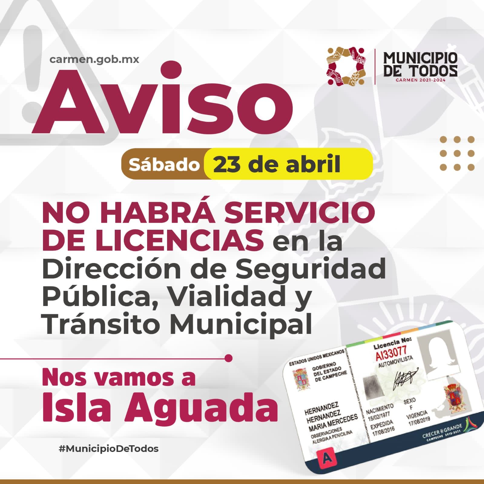Por tal motivo, este sábado 23 NO habrá trámites en las oficinas de la DSPVTM ubicadas en Ciudad del Carmen.