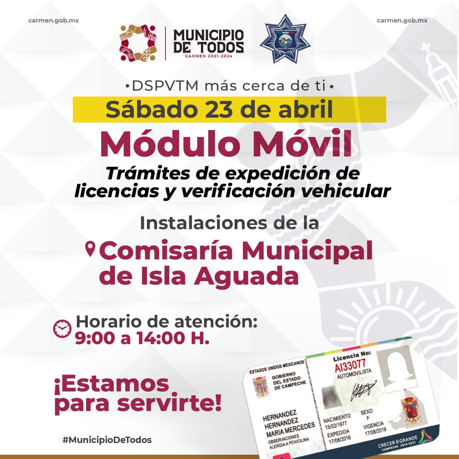El Módulo Móvil de trámites de la Dirección de Seguridad Pública, Vialidad y Tránsito Municipal (DSPVTM) estará este sábado 23 de abril en las oficinas la Comisaría Municipal de ISLA AGUADA, en horario de 9:00 A.M. a 2:00 P.M., para realizar expedición de licencias y verificación vial.