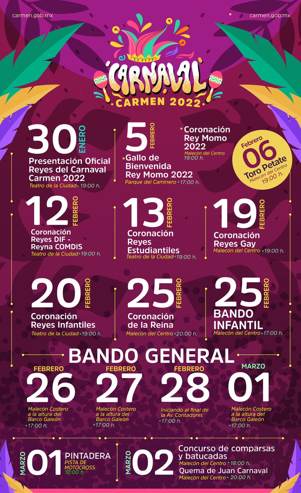 El 6 de febrero te invitamos al tradicional Toro Petate en el Malecón del Centro a las 7:00 P.M.; el 12 de febrero se coronará a los Reyes DIF Carmen y la Reina COMDIS en el Teatro Carmelita a las 7:00 P.M.; el 13 de febrero será la coronación de los Reyes Estudiantiles a las 7:00 P.M. en el Teatro de la Ciudad.