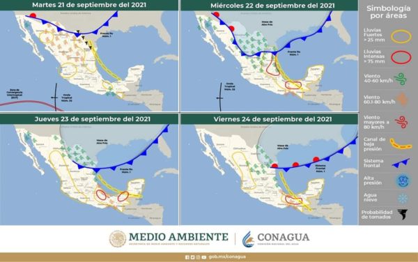 El viento estará fijándose del Norte de entre 20 a 40 km/h con rachas que pueden superar ocasionalmente los 60 Km/h, así como oleaje elevado en la franja costera del Estado. Esta condición de viento permitirá un descenso en las temperaturas dejando máximas entre 29°C y 35°C mientras que las mínimas rondarán los 20°C durante el transcurso del jueves y viernes.