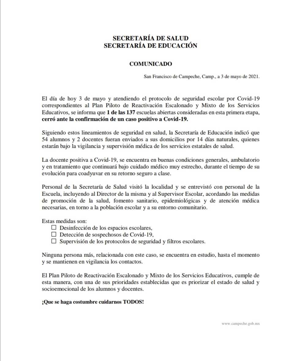El día de hoy 3 de mayo y atendiendo el protocolo de seguridad escolar por Covid-19 correspondientes al Plan Piloto de Reactivación Escalonado y Mixto de los Servicios Educativos, se informa que 1 de las 137 escuelas abiertas consideradas en esta primera etapa, cerró ante la confirmación de un caso positivo a Covid-19.