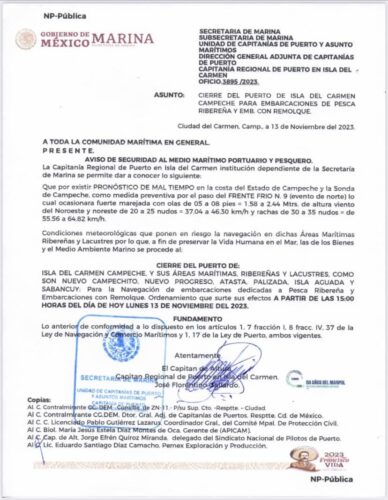 Cierre de la Isla del Carmen a partir de las 15:00 hrs. tomen precauciones embarcaciones ribereñas y embarcaciones con Remolque.