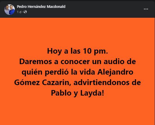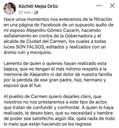Confirma en un post la Esposa de Alejandro Gómez Cazarin (q.e.p.d.) Xóchitl Mejía Ortiz hace unos momentos en su cuenta de FB en redes sociales que es totalmente FALSO dicho Audio que le atribuyen a su esposo.