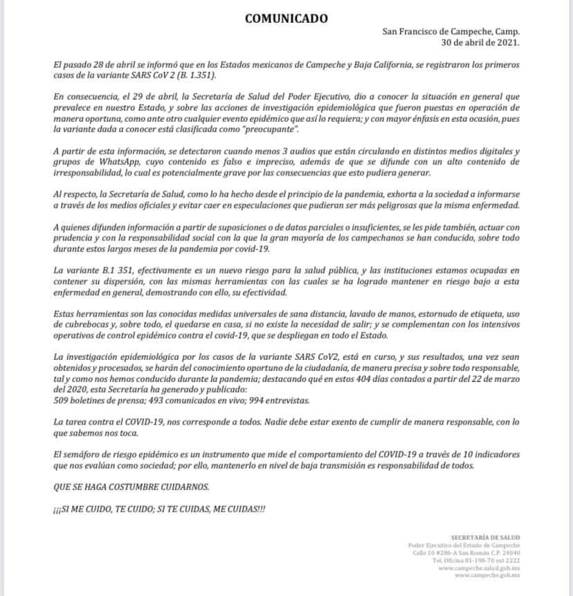 El pasado 28 de abril se informó que en los Estados mexicanos de Campeche y Baja California, se registraron los primeros casos de la variante SARS CoV 2 (B. 1.351).
