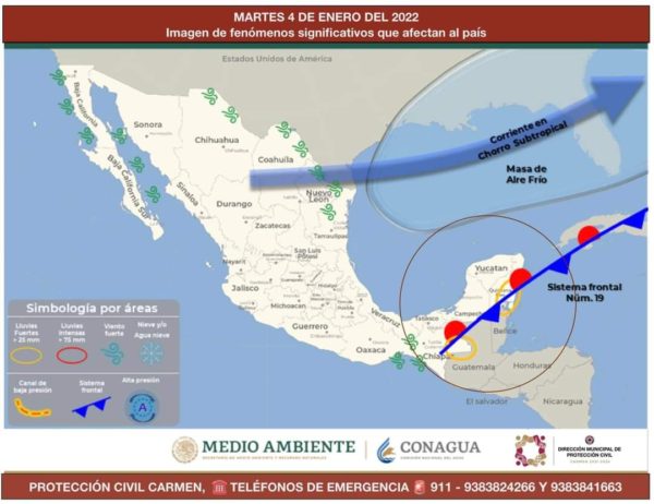 – En las próximas 24 hrs, el Frente Frío No. 19 se extenderá con características de estacionario al sur de la Península de Yucatán, dejando descenso en las temperaturas, además de las siguientes condiciones en nuestro municipio.