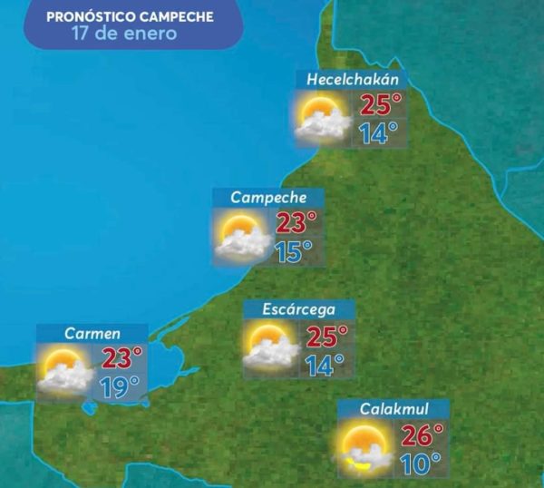 Yucatán: Cielo medio nublado, con probabilidad para lloviznas sobre la porción noreste, oriente y norte del estado. Temperaturas cálidas durante el día y frías a frescas al amanecer. Viento de dirección norte-noreste de 15 a 25 km/h y rachas de 40 km/h sobre el litoral costero.