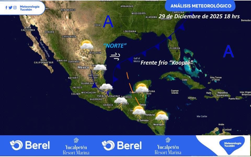 Los modelos meteorológicos indican que “Koopté” arribará formalmente a la península de Yucatán durante el transcurso del martes. Este avance mantendrá vigente el potencial de tormentas y vendrá acompañado de una potente masa de aire ártico.