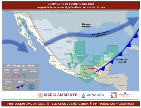 – Durante este día, el #FrenteFrío No. 29 recorrerá el sureste del país y la Península de Yucatan, prevaleciendo evento de “norte” en nuestro municipio, con las siguientes condiciones.