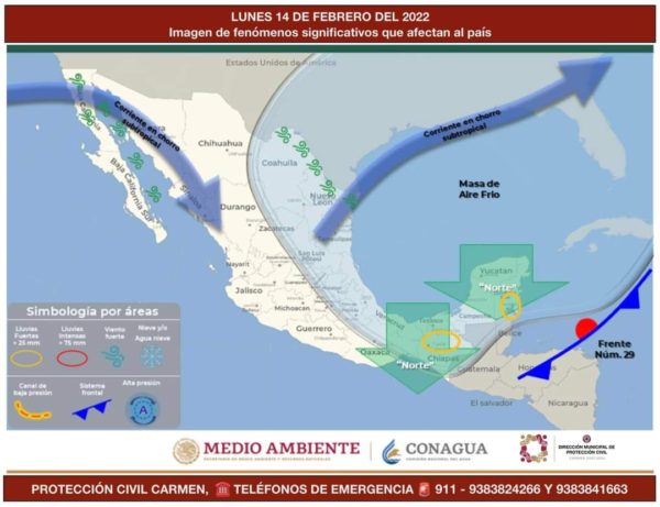– Para hoy, la masa de aire frío que dio impulso al frente No. 29 cubrirá gran parte de la Península de Yucatán, lo que dará paso a las siguientes condiciones.