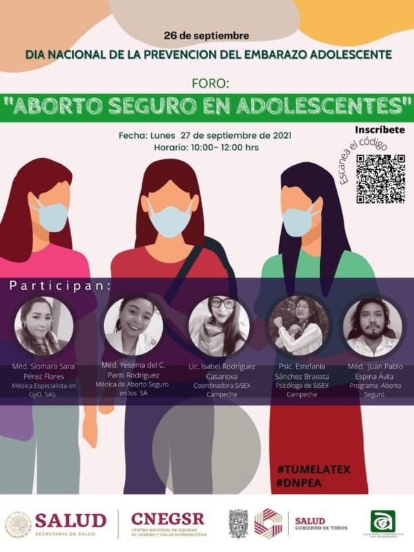 Para contribuir a que en el Estado se presenten menos casos de embarazos en adolescentes, la Secretaría de Salud del Gobierno del Estado llevará a cabo este lunes 27 de septiembre, de 10:00 a 12:00 horas, el Foro “Aborto Seguro en Adolescentes”, mismo que será impartido por personal del programa de Salud Sexual y Reproductiva para Adolescentes a través de la plataforma digital Zoom https://us02web.zoom.us/j/85756267796?pwd=VWFvNDNMRmFDM3JJbWFqYnZDeFdndz09 y la red social de Facebook Salud Campeche, siendo dirigido al personal del sector.