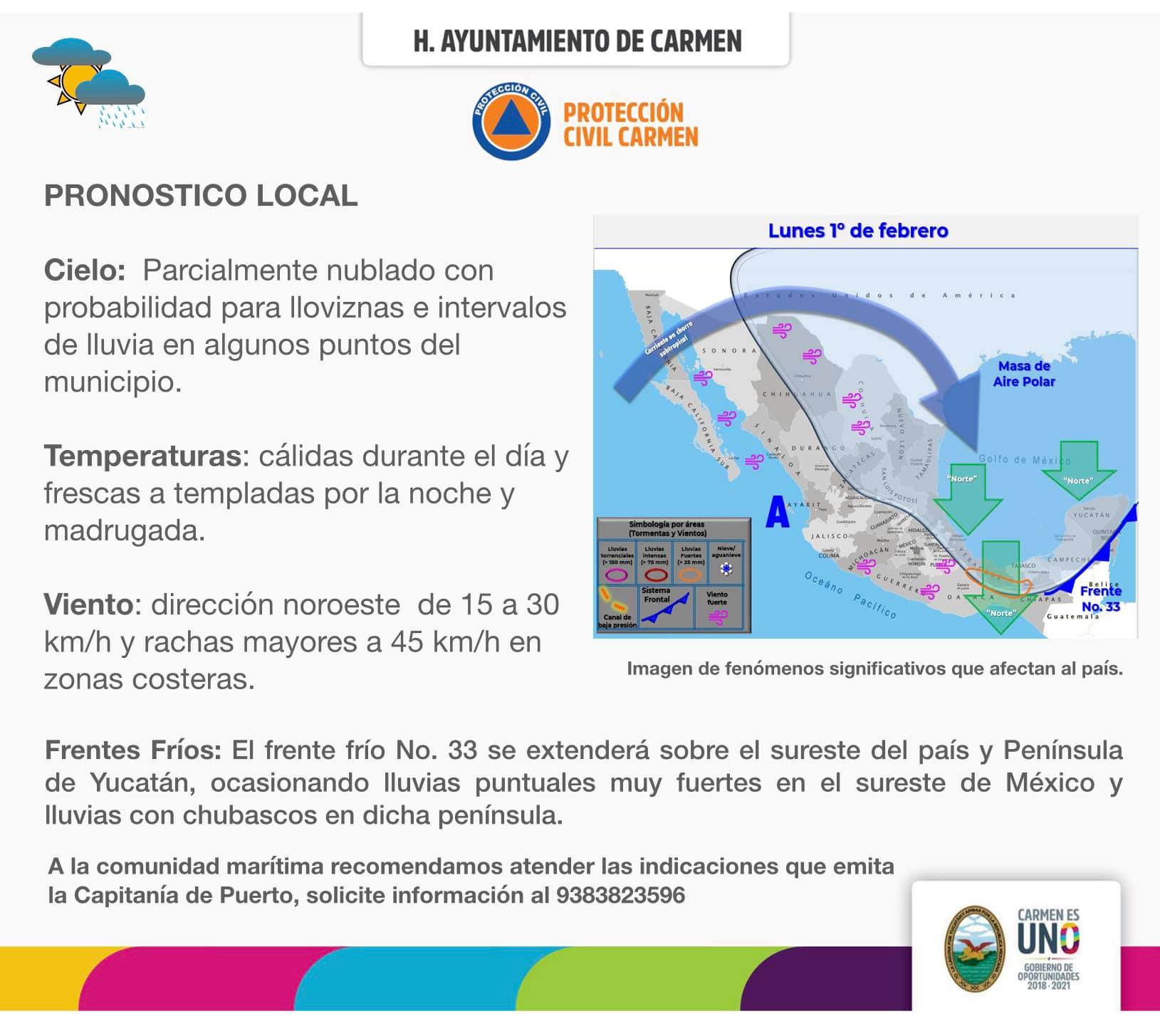 -En las próximas 24 hrs, el frente frío No. 33 avanzará sobre la Península de Yucatán, generando condiciones de cielo parcialmente nublado con lloviznas e intervalos de lluvia en el Municipio.