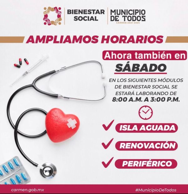 Comprometidos con la salud de los ciudadanos, los Módulos de Bienestar Social del Gobierno Municipal informa que, en Isla Aguada, la colonia Renovación y Periférico, ahora también ofrecerán atención los sábados de 8:00 A.M. a 3:00 P.M.