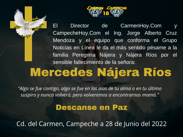 El Director de CarmenHoy.Com y CampecheHoy.Com el Ing. Jorge Alberto Cruz Mendoza y el equipo que conforma el Grupo Noticias en Línea le da el más sentido pésame a la familia Peregrina Nájera y Nájera Ríos por el sensible fallecimiento de la señora: