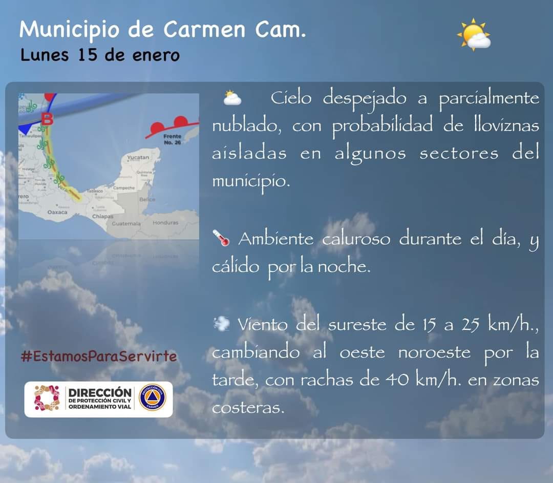 – Durante las próximas 24 hrs., el ingreso de aire marítimo tropical proveniente del Mar Caribe, favorecerá las siguientes condiciones para nuestro municipio.