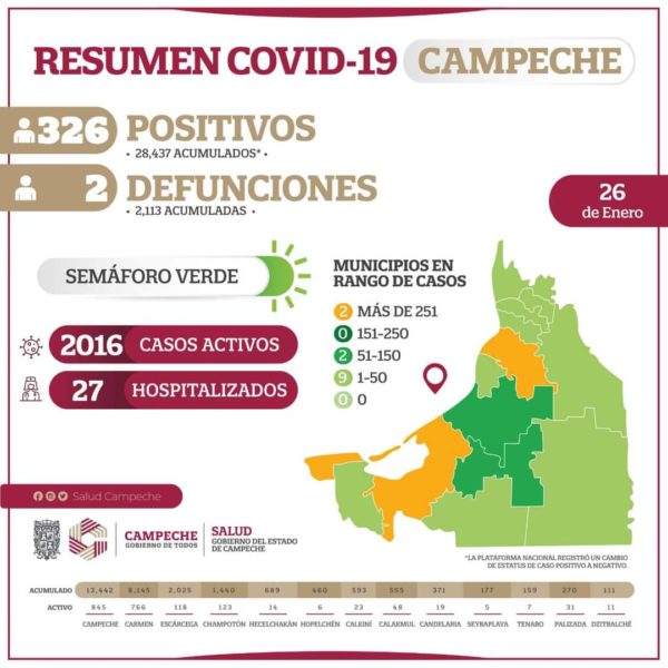 En el reporte de Covid de este día, la Secretaría de Salud informa 326 nuevos casos positivos, con 2016 casos activos en todo el territorio estatal, así como 2 defunciones.