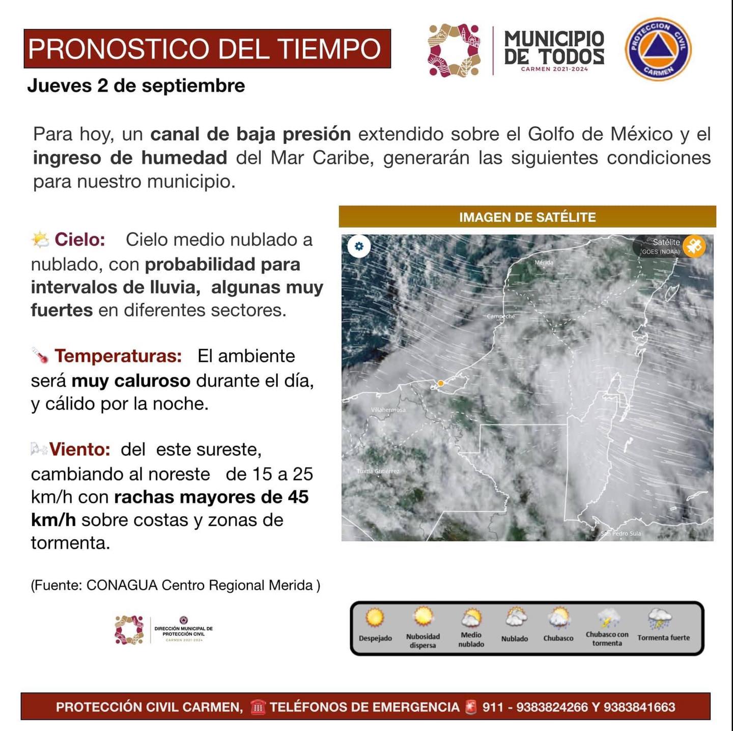 Canal de baja presión en el Golfo de México y entrada de humedad del Mar Caribe, generan cielo nublado con intervalos de lluvia, algunas muy fuertes, en el municipio.