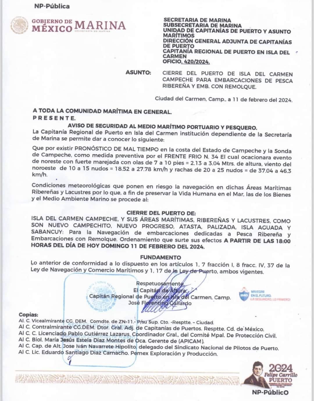 La Capitanía de Puerto informa del CIERRE del puerto de Isla del Carmen y sus áreas marítimas adscritas para: EMBARCACIONES RIBEREÑAS Y CON REMOLQUE a partir de las 18:00 horas de hoy.