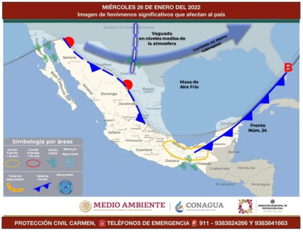 Actualmente el Frente Frío No. 24 recorre la Península de Yucatán, se prevé que durante este día continúe su avance rumbo al occidente del Mar Caribe, dando paso a las siguientes condiciones para nuestro municipio.