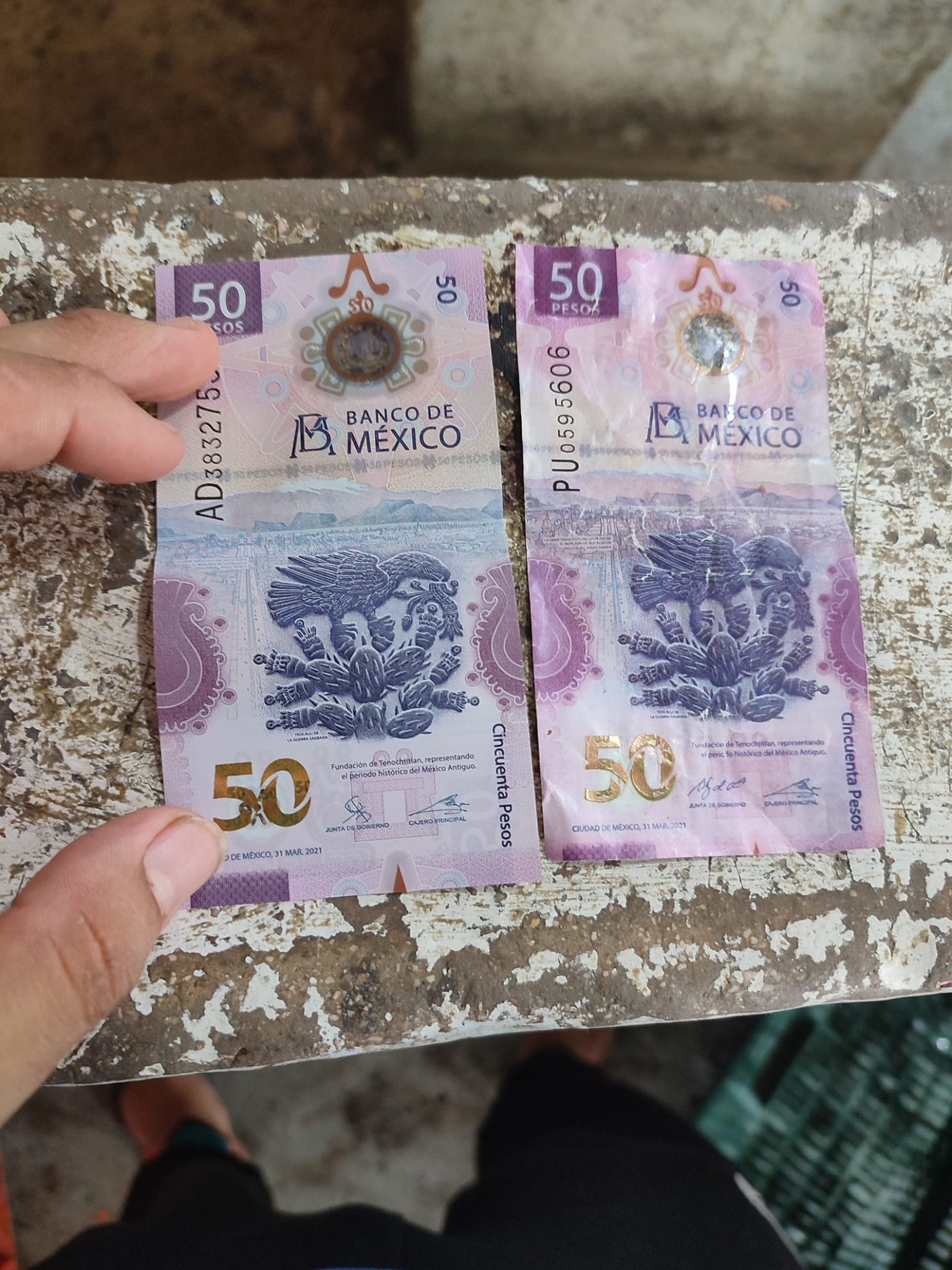 Fabián Sánchez Navarro pidió a los campechanos estar alerta a la hora de recibir el nuevo billete de 50 pesos del ajolote, en la imagen se puede apreciar que tienen un tamaño y textura diferente.