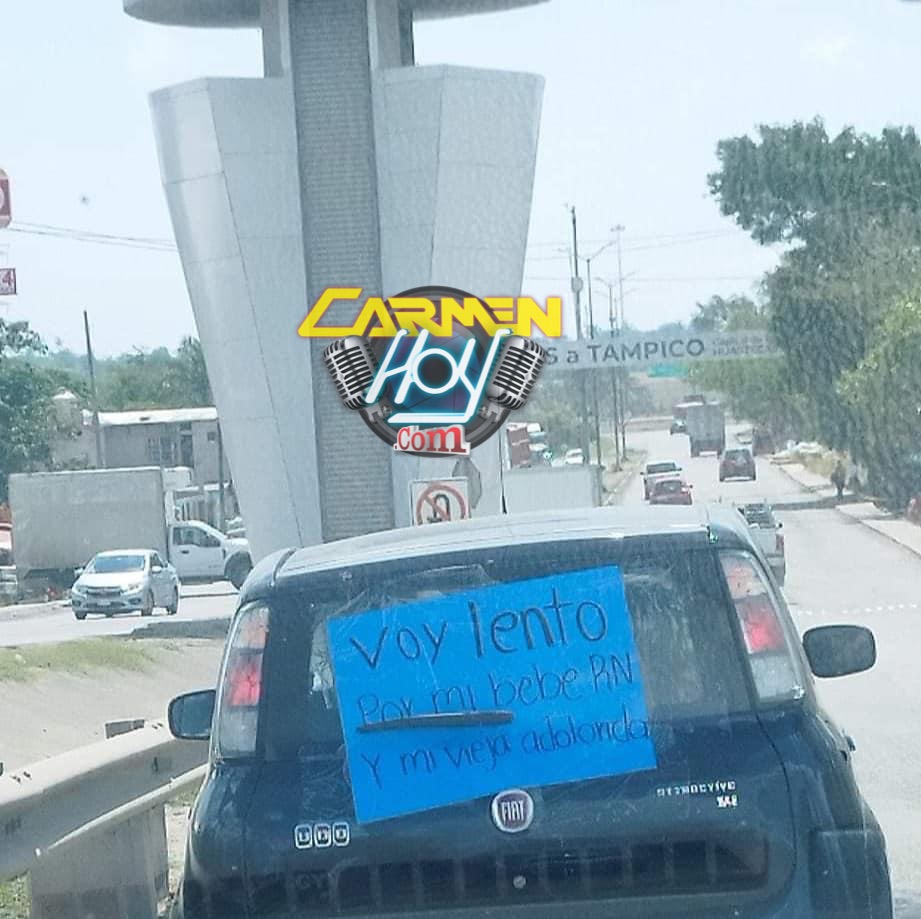 Un automovilista de identidad desconocida se viralizó luego de colocar un letrero en su auto en el que explicaba la razón del porqué iba lento por las calles de #Tampico.