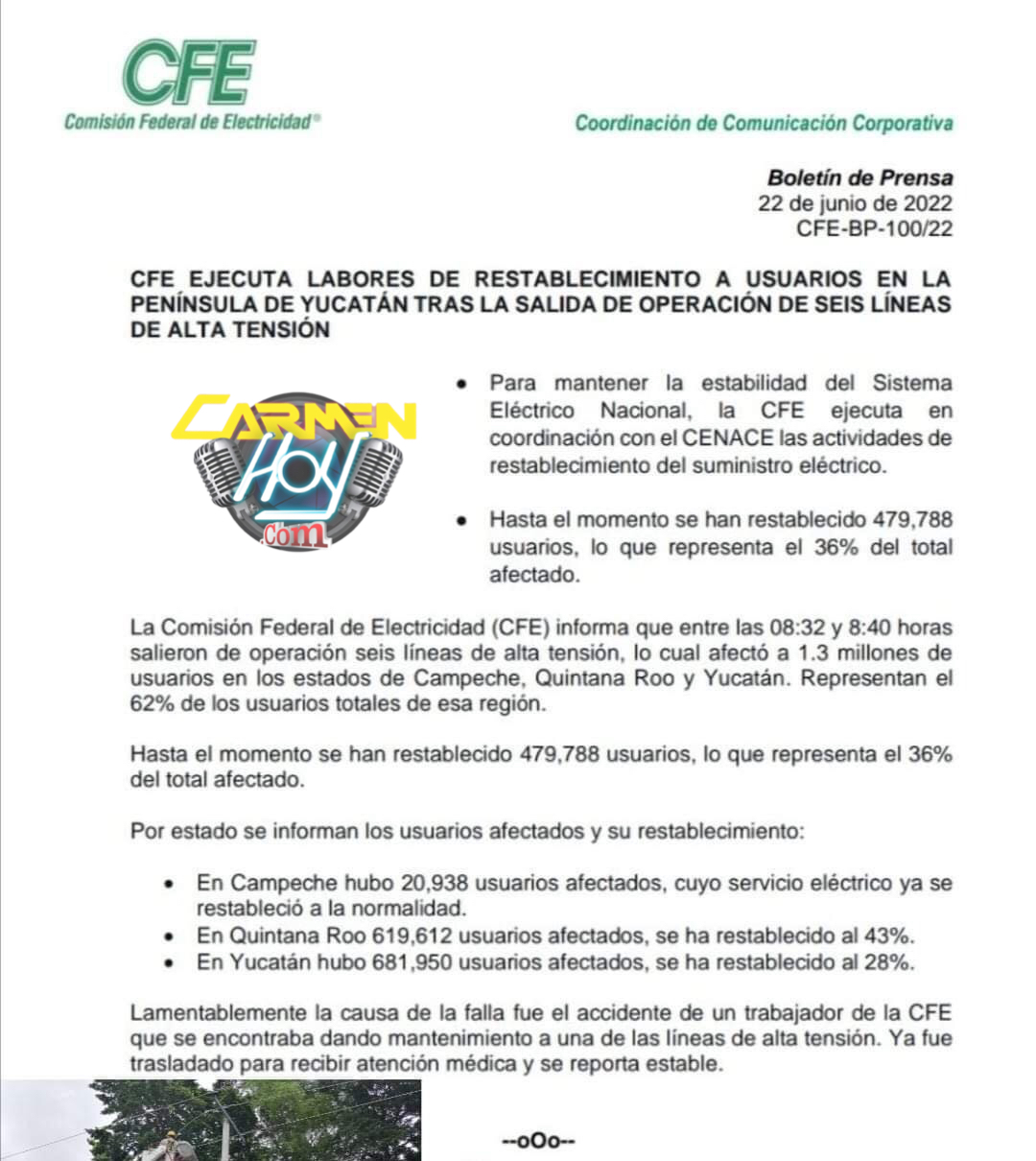 La Comisión Federal de Electricidad (CFE) informa que entre las 08:32 y 8:40 horas de hoy miércoles, salieron de operación seis líneas de alta tensión, lo cual afectó a 1.3 millones de usuarios en los estados de Campeche, Quintana Roo y Yucatán.