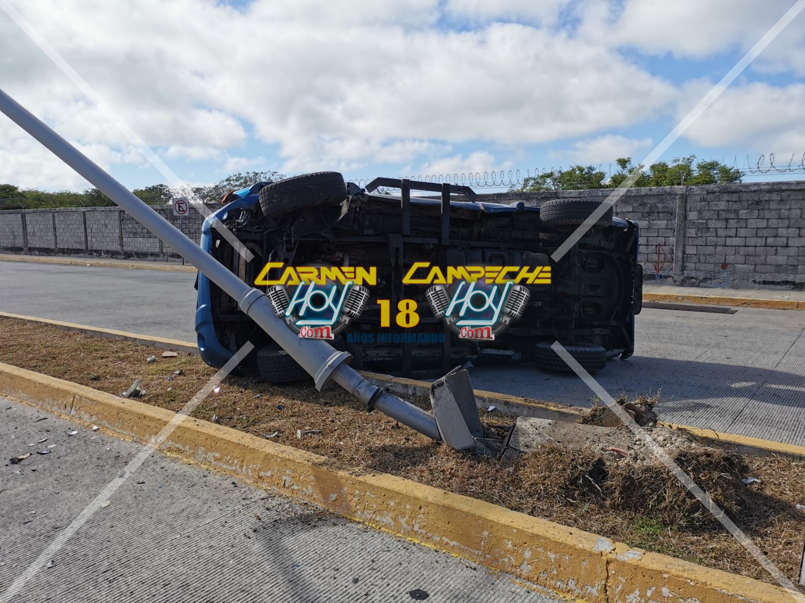 En el lugar, una luminaria propiedad del municipio quedó averiada tras recibir el impacto de la unidad tras la volcadura, el conductor responsable se dio a la fuga dejando la unidad abandonada.