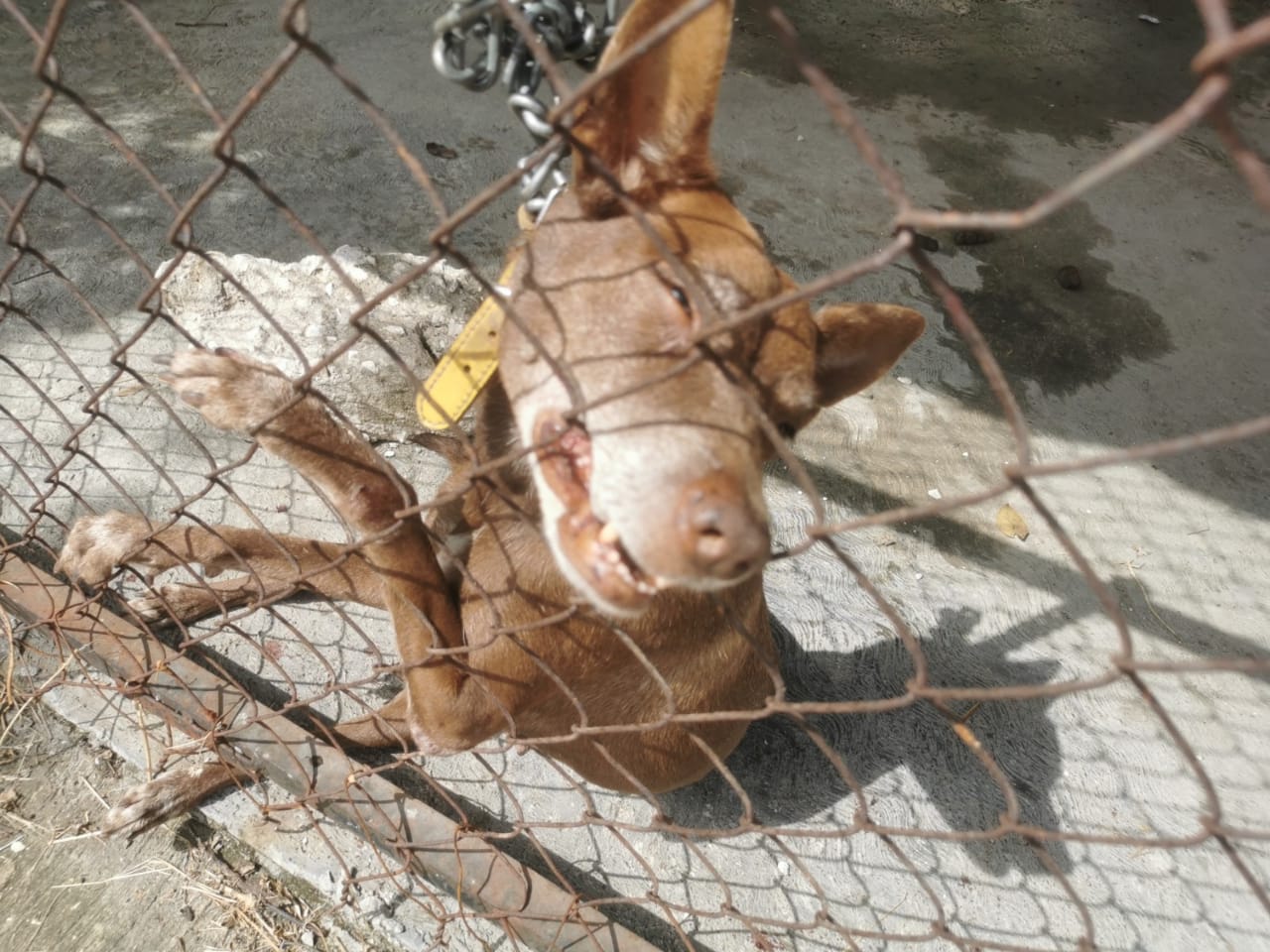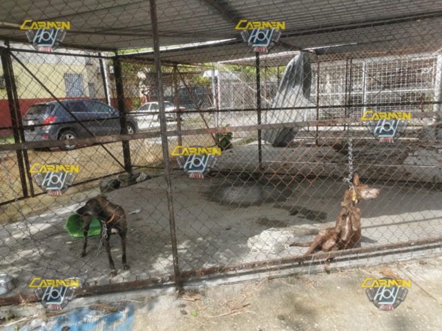 Los hechos ocurrieron cerca de las 12:00 del día, cuando sobre la calle 44 esquina con calle 41 de la colonia Tecolutla y sobre los edificios de doña nicha, dos caninos fueron encadenados dentro de un enrejado de estacionamiento.
