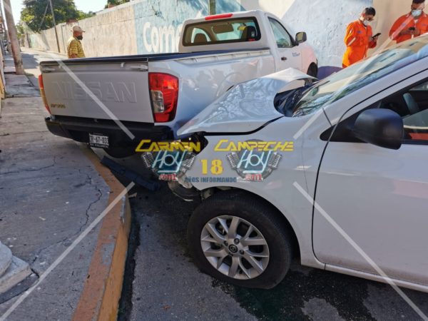 El percance ocurrió alrededor de las 8:50 horas, sobre la calle 30 por 25 de la colonia guanal, lugar donde trabajadores de la compañía petrolera “Naviera Integral”, se desplazaban a bordo de una Nissan NP300, color blanco con matrícula de circulación CR-67-033 con registro en el Estado de Campeche.