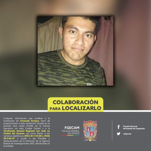 Cualquier información que conlleve a la localización de Armando Enrique, favor de proporcionarlo a esta institución situada en la avenida José López Portillo de la colonia Sascalum, en esta Ciudad Capital y a la Vicefiscalía General Regional con sede en Ciudad del Carmen, así como llamar a los números telefónicos (981) 81-1-94-00 y (938) 38-2-06-79 o acudir a las Fiscalías y destacamentos de la Dirección de la Agencia Estatal de Investigaciones (AEI), distribuidas en la entidad.