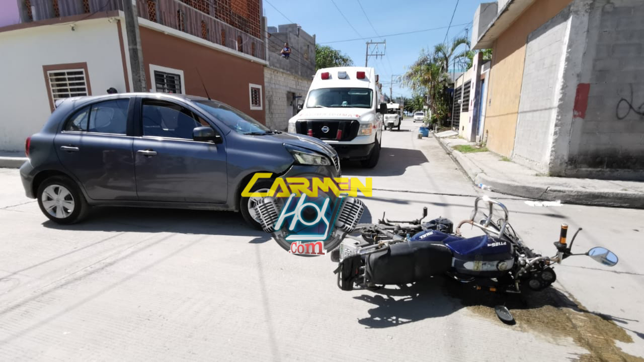 Fue alrededor de las 14:10 horas, qué un ciudadano se desplazaba en su motocicleta, italika, color azul con matrícula de circulación 48CUP9 del estado de Campeche, con dirección a su domicilio luego de una jornada laboral, avanzaba en preferencia sobre la calle Osa mayor con dirección a la avenida paseo del mar de la colonia Tierra y Libertad, cuándo justamente al cruzar sobre la calle Venus de está misma colonia, la conductora de un automóvil Nissan March, color gris con matrícula de circulación DKD-63-24 del estado de Campeche No respetó la preferencia de vialidad según las flechas de tránsito, cortó circulación al motorista, mismo que al no lograr frenar se impacto contra el costado lateral derecho del vehículo y terminó tirado en el pavimento con la rodilla izquierda inflamada tras recibir el golpe.