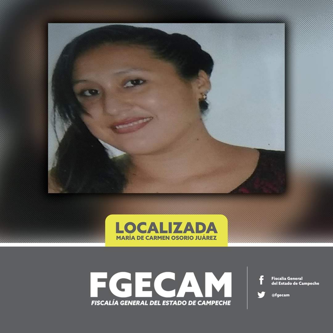 La FGECAM da a conocer la cancelación de la búsqueda de María de Carmen Osorio Juárez de 30 años de edad, quien contaba con reporte de persona no localizada ante la Fiscalía de Champotón.