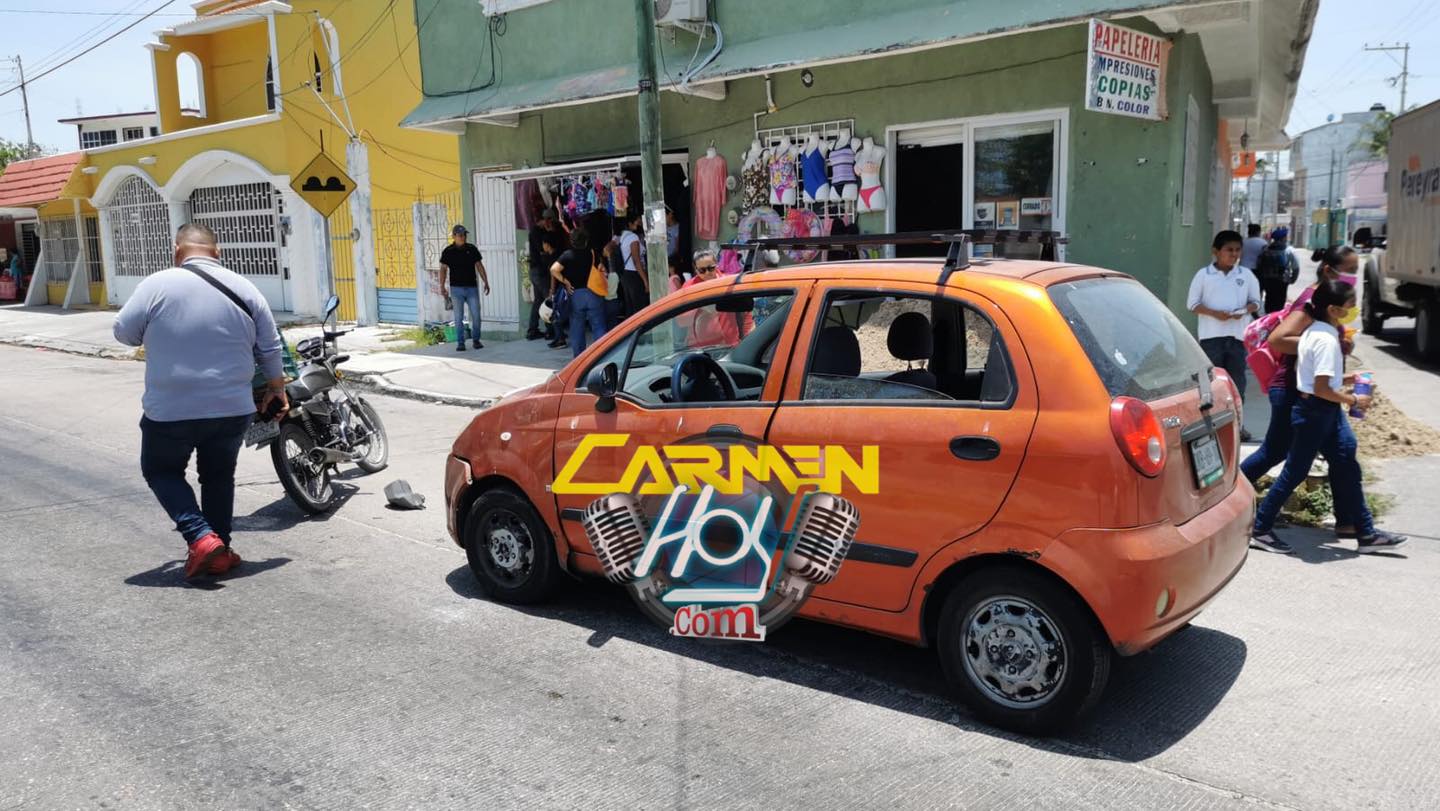 Al llegar al cruce con la calle 62 y justamente frente a la escuela primaria, Ricardo Mojes, el Motociclista intento dar vuelta en U, sin percatarse que venía de frente el guiador de un vehículo particular de la marca Chevrolet Matiz G2, color naranja con matrícula de circulación DKB-69-10 del estado de Campeche.