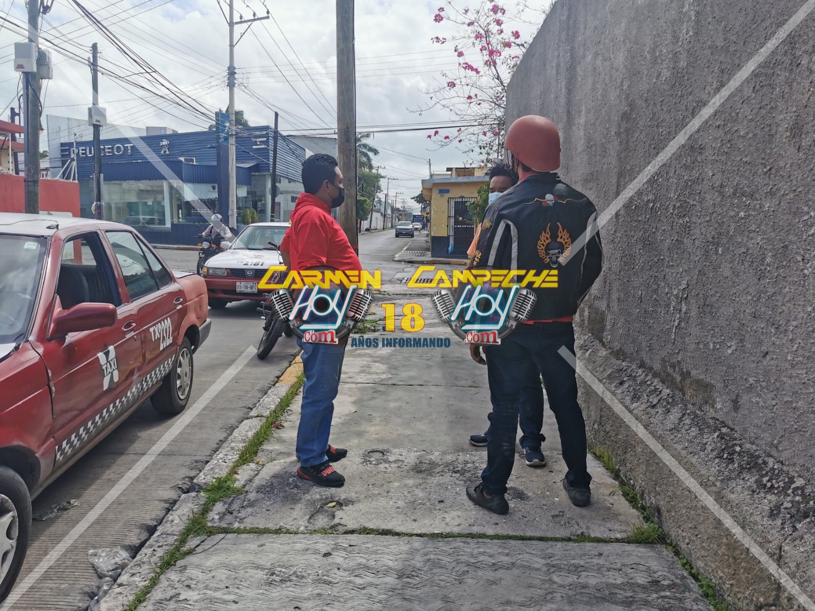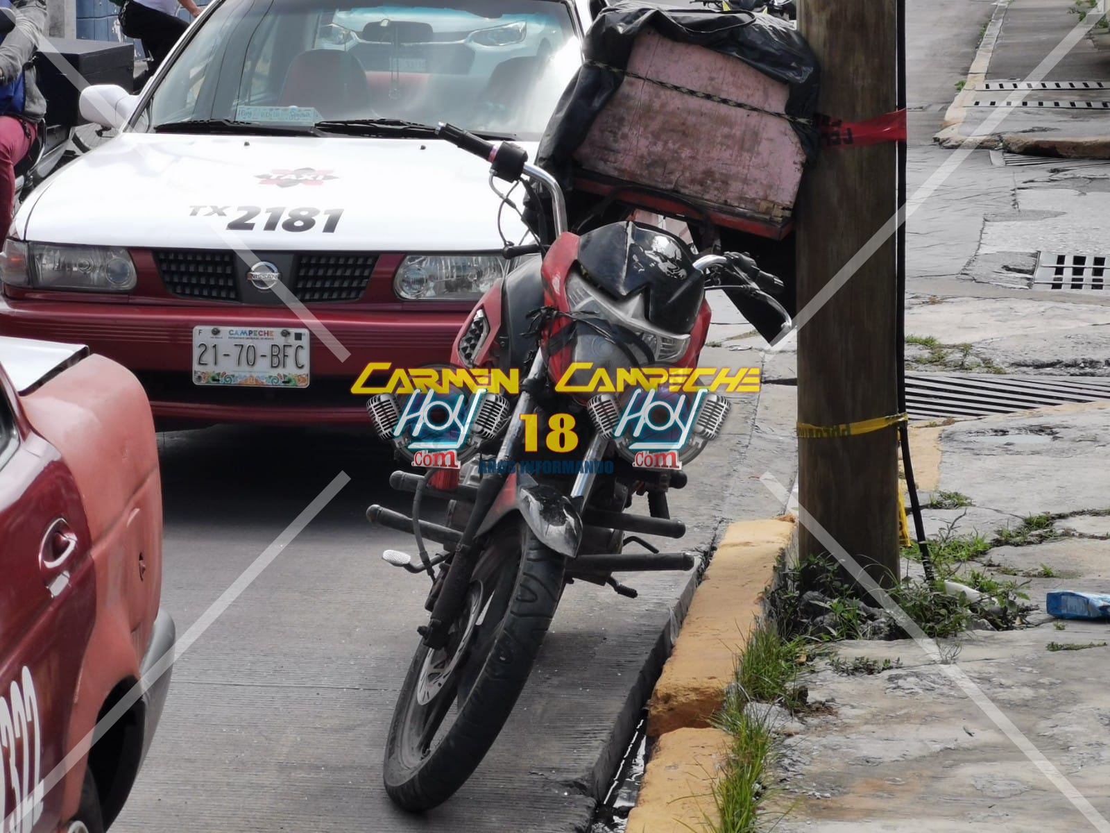 El motorista al llegar al cruce con la calle 31 la cual tiene preferencia vehícular, se impacto contra el costado lateral izquierdo, causando daños en la fascia y faro al vehículo Nissan Tsuru, marcado con el número económico 2322 y matrícula de circulación 37-89-BFC del estado de Campeche.
