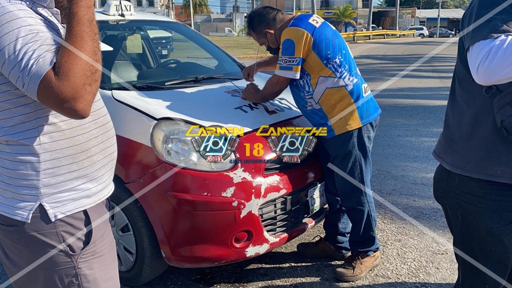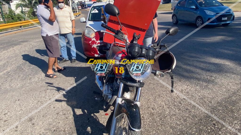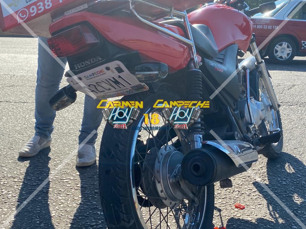 Esta tarde se generó un percance vehicular alrededor de las 15:30 horas, sobre la avenida puerto de Progreso por isla de Tris de la colonia Plutarco Elías Calles, lugar donde el chófer de un taxi marcado con el número económico 2337 y matrícula de circulación 25-44-BFC del estado de Campeche circulaba detrás de una motocicleta de la marca Honda, color rojo con matrícula de circulación 42CVM1 del estado de Campeche dedicada al servicio de moto mandaditos, desafortunadamente el chófer de la unidad de alquiler, no guardó la distancia correspondiente y colisionó contra la moto.