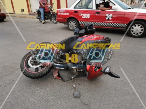 El percance ocurrido alrededor de las 17:10 hrs en las inmediaciones de la colonia Tila, tuvo como protagonistas a una pareja que venía a bordo de una motoneta Italika, color rojo con matrícula de circulación WSC7U del Estado de Campeche y la unidad de servicio de taxi número 2245 con placas de circulación 34-84-BFC del Estado de Campeche