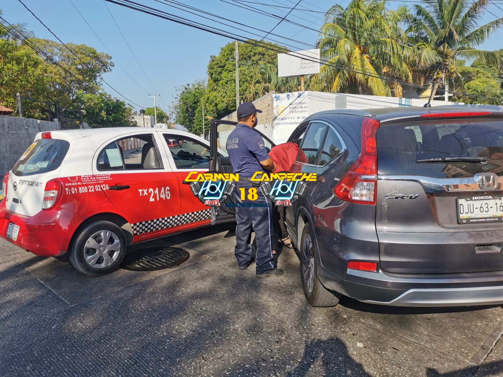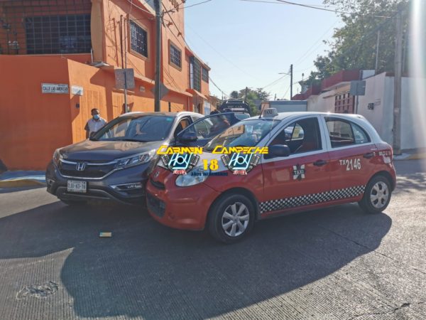 El hecho de tránsito ocurrió alrededor de las 10:30 horas de esta mañana, Sobre la avenida las Américas por calle José María Morelos y Pavón de la demarcación antes mencionada, lugar donde el chafirete de un vehículo de la marca Nissan March, color rojo con blanco, número económico 2146 y matrícula de circulación 25-07-BFC del estado de Campeche afiliado al Sindicato Único de Trabajadores del Volante SUTV avanzara en aparente preferencia Sobre la avenida las Américas con dirección a la avenida Aviación, cuándo justamente al llegar al cruce con la calle José María Morelos y Pavón la conductora de una camioneta particular de la marca, Honda CR-V, color titanium, con matrícula de circulación DJU-63-16 del estado de Campeche, no respetó a la preferencia y tras cruzar sin precaución se impactó contra el taxi de frente.