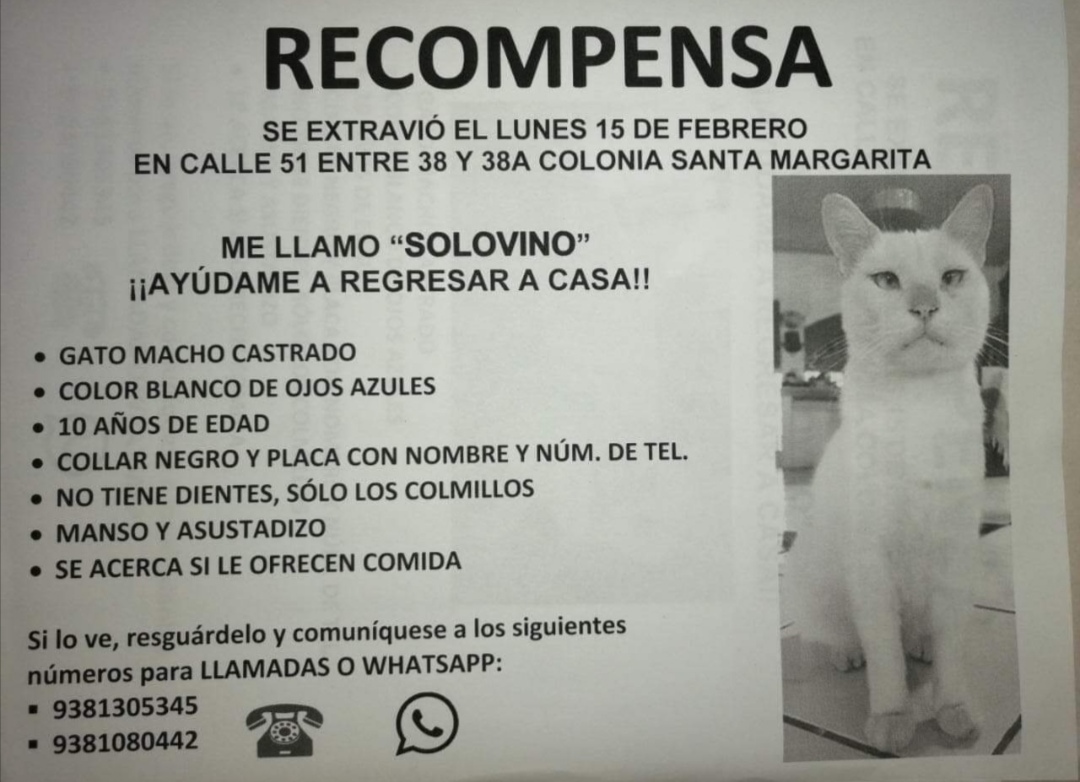 ‼️¡Estoy desesperada!‼️ Solovino es un gato viejito, no ve bien y no tiene dientes. Responde al nombre de “SOLO”, se perdió el día 15 de febrero a las 6:30pm, trae collar y plaquita con identificación. Si alguien lo vio marcar a los números 9383822320, 9381080442 y 9381305345.