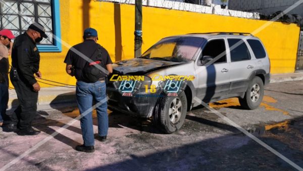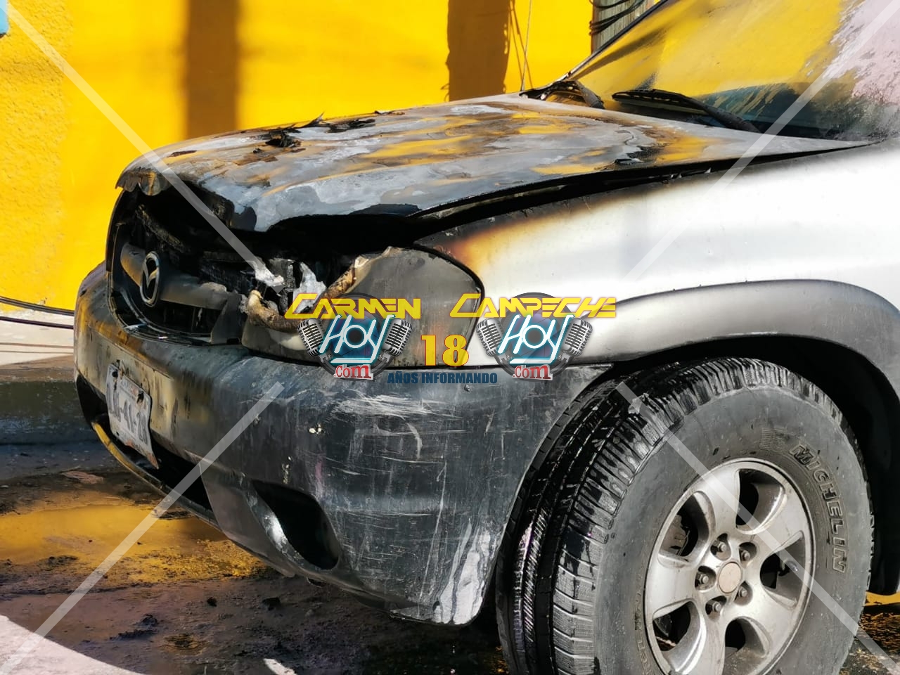 Una camioneta de la marca Mazda “Tribute” con matrícula de circulación DJU-41-28 del estado de Campeche, se quemó por un corto circuito en la batería, esto sobre la calle Rosa por calle Lirio del fraccionamiento Puente la Unidad.