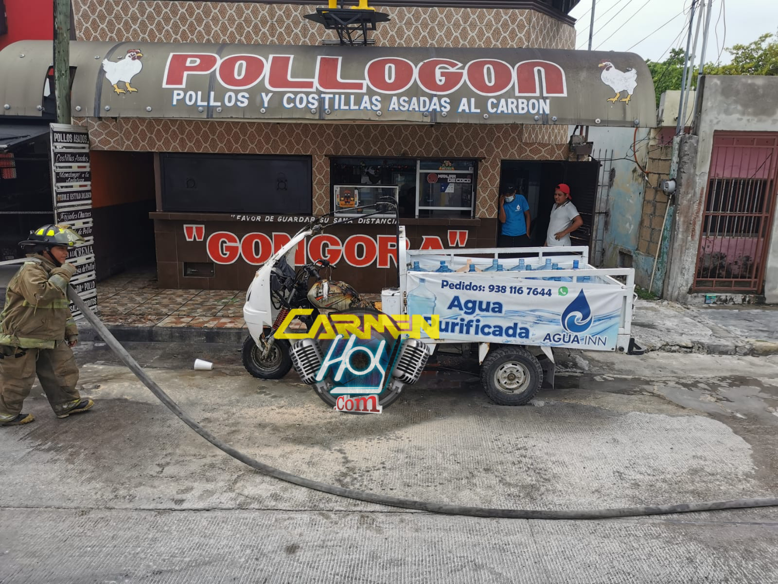 Una carromoto vendedora de agua terminó reducida a cenizas tras incendiarse a causa de un corto circuito en el área del motor en la colonia Justo Sierra; autoridades municipales y personal de bomberos locales acudieron para controlar la situación.