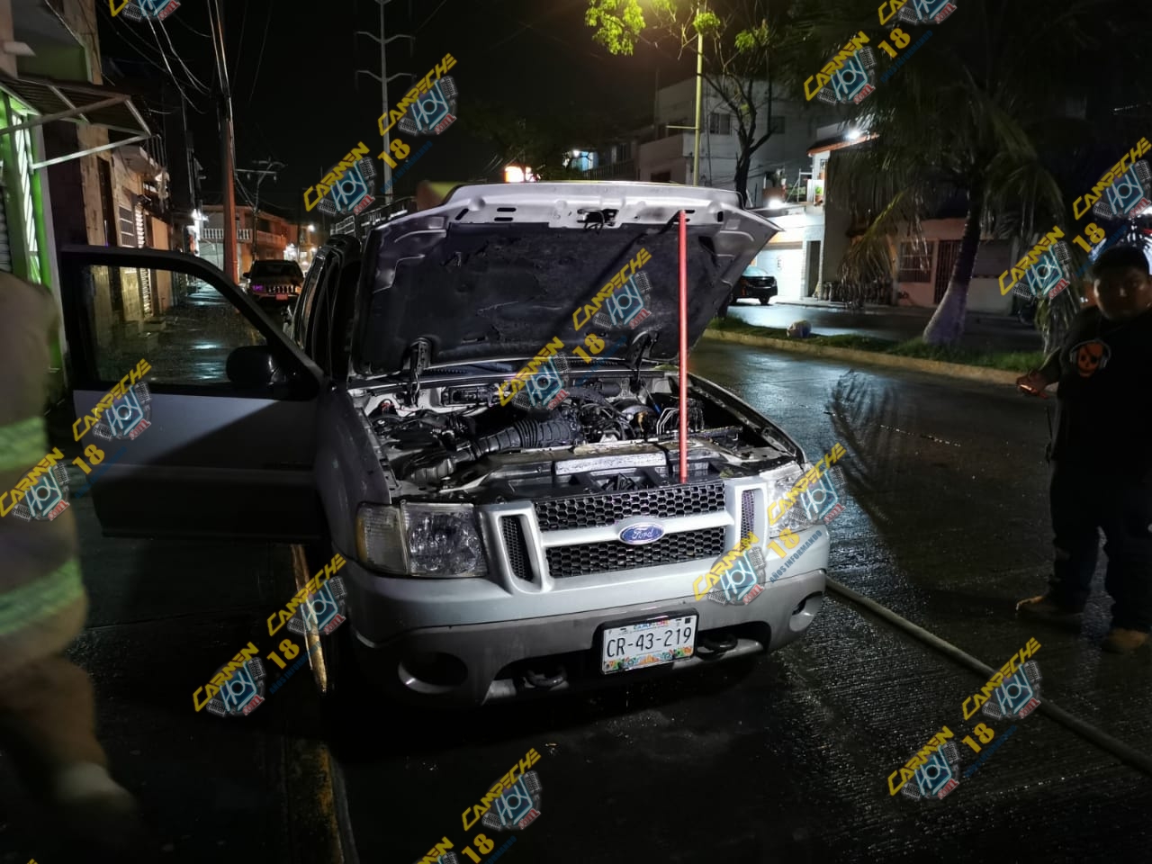 Un camioneta particular estuvo a punto de terminar calcinada por las llamas generadas por un corto circuito en el área de la batería, afortunadamente bomberos locales lograron sofocar las llamas.